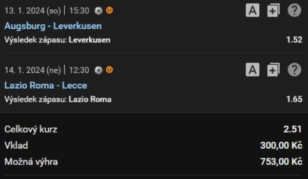 Důvěra ve vítězství aktuálního lídra tabulky německé Bundesligy Bayeru Leverkusen na hřišti průměrného Augsburgu a předpoklad plnohodnotného bodového zisku římského Lazia, které přivítá v nedělním utkání italské Serie A třinácté Lecce, to je letošní premiérový Sforziho tiket se dvěma pečlivě vybranými zápasy s hodnotnými kurzy a s tradičním vkladem 300,-Kč.