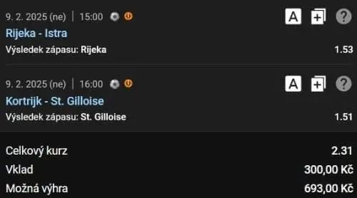 Předpoklad tříbodového zisku aktuálního lídra tabulky nejvyšší chorvatské ligy a vicemistra uplynulé ligové sezóny HNK Rijeka v domácím střetnutí s podprůměrnou Istrou 1961 a důvěra ve vítězství třetího celku belgické Jupiler Pro League Royale Union Saint-Gilloise na půdě předposledního Kortrijku, to je první únorový Sforziho tiket se dvěma pečlivě vybranými fotbalovými zápasy s hodnotnými kurzy a s tradičním vkladem 300,-Kč.