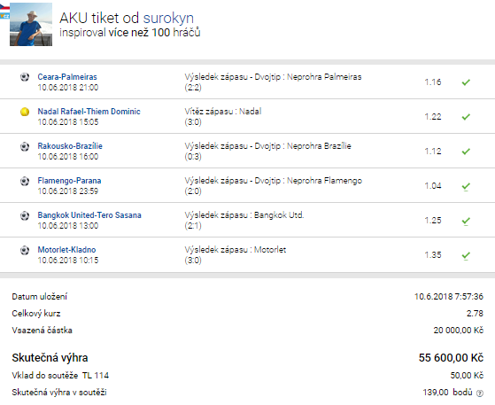 10. června 2018 těsně před 8 hodinou ranní se v tiket areně sázkové kanceláře Tipsport objevila níže přiložená sázenka čítající 5 fotbalových a 1 tenisovou příležitost, na kterou si tipér s přezdívkou surokyn vsadil 20.000,- Kč v celkovém kurzu 2,78. Jak to dopadlo? A co autora níže přiložené sázenky vedlo k poskládání této kombinace dohromady?