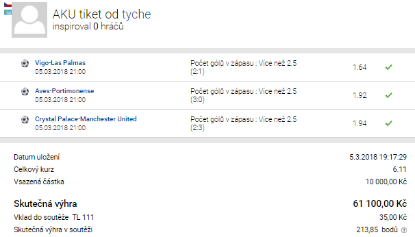 Náš další rozbor tiketu se tentokrát věnuje sázence podané u sázkové kanceláře Tipsport za 10 tisíc korun. Jejím předmětem byla trojice fotbalových tipů na stejnou příležitost: celkem v zápase padne více než 2,5 gólu. Dílčí kurzy z intervalu od 1,64 do 1,94, které daly dohromady celkový kurz 6,11, přitom slibovaly výhru 61.100,- Kč. Jak to dopadlo a co tipéra s přezdívkou tyche k podání níže přiloženého tiketu vedlo?