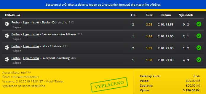Sečteno, podtrženo, klient Fortuny s nickem ren*** vsazených 600,- Kč zhodnotil v celkovém kurzu 8,56. Ten dalo dohromady kvarteto dobře mířených tipů s jednotlivými kurzy od 1,30 do 2,08. Jen několik hodin po podání sázenky, které se dnešní rozbor tiketu věnuje, tak úspěšný sázkař zinkasoval 5.136,- Kč. Jediné, čeho tak může zpětně litovat, je výše vložené částky. Představte si, že by vsadil např. za 10.000,- Kč…