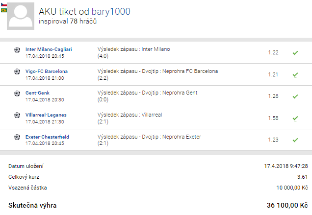 Suma sumárum, tiket byl vyhodnocen jako výherní, což z pohledu sázkaře bary1000 znamenalo jediné – z vkladu 10.000,- Kč vsazeném v celkovém kurzu 3,61 si přišel na fajn výhru 36.100,- Kč!