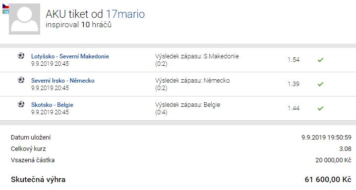 Suma sumárum, klient sázkové kanceláře 17mario vsadil 9. 9. krátce před 20. hodinou 20.000,- Kč na výše přiložený AKU tiket. Po kladném vyhodnocení všech 3 příležitostí a vynásobení vkladu celkovým kurzem 3,08 tak 17mario zkasíroval Tipsport o výhru 61.600,- Kč. Čistý zisk? 41.600,- Kč!