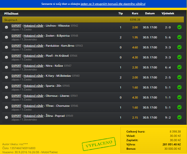Jeden z jeho klientů totiž vsadil nejnižší povolený vklad, tedy 5 Kč, na celkem 6 hokejových příležitostí. Nejednalo se přitom o žádné tutovky, když dílčí kurzy spadaly do intervalu od 3,20 až do 6.