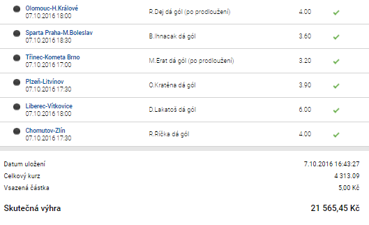 I taková sázenka, s celkovým kurzem 4 313,09, však může přinést svoje ovoce! Třeba v podobě výhry 21 565,45 Kč.