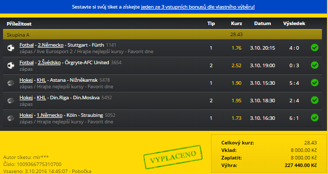 Rovněž on postupoval odlišným způsobem, než jeho trojice “kolegů”, když na celkem 5 sportovních tipů (2 fotbalové a 3 hokejové) vsadil částku 8 000 Kč. S ohledem na dílčí kurzy, z intervalu od 1,73 do 2,52, mu případný status “WIN” sliboval výhru 227 440 Kč.