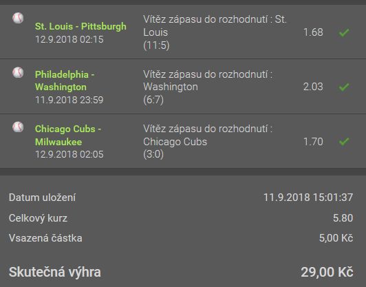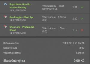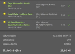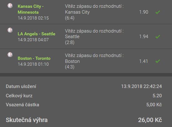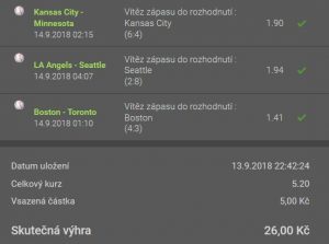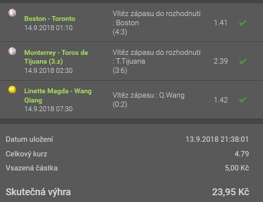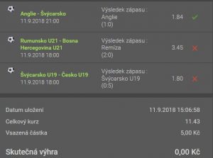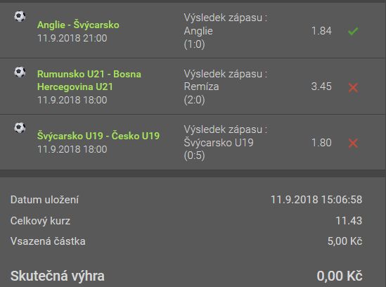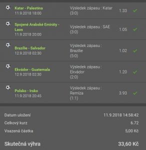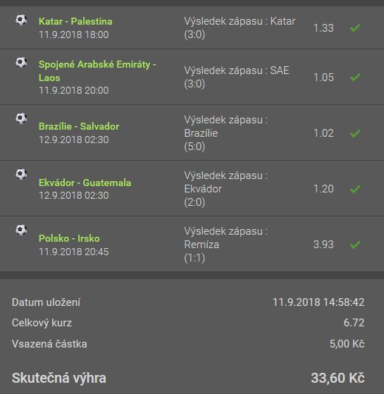 Sázel jsem jen částečně podle této strategie u Chance (vylepšování kurzů zápasy navíc, sázení nižších kurzů než 1,8, vyloučení jednoho z výsledků), ale počítal jsem podle zadání s jednou chybou (vsadil jsem opačný výsledek, než jsem předpokládal). Z osmi testů jich bylo kupodivu 6 úspěšných.
