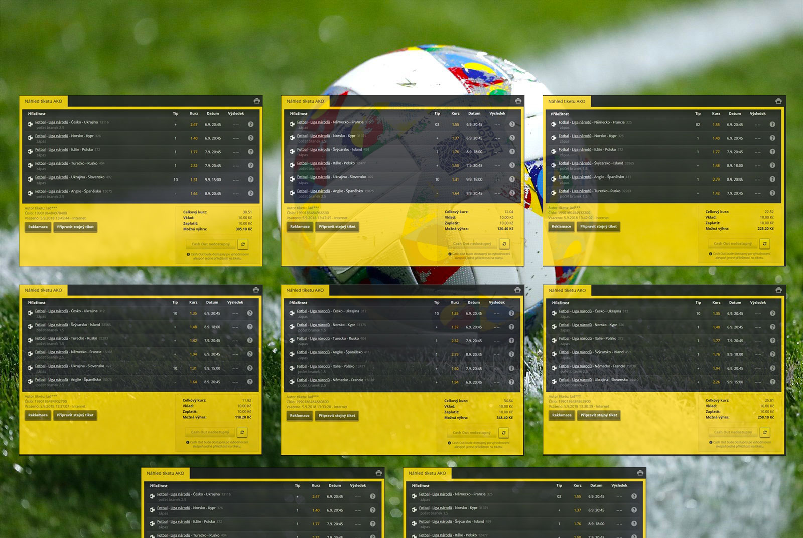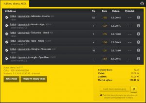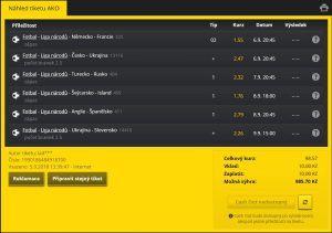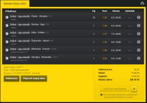 - Na čtvrtý tiket: Neprohra Francie / over 2,5 g v zápase Česko – Ukrajina / výhra Turecko / výhra Švýcarsko / výhra Anglie / over 2,5 v zápase Ukrajina – Slovensko