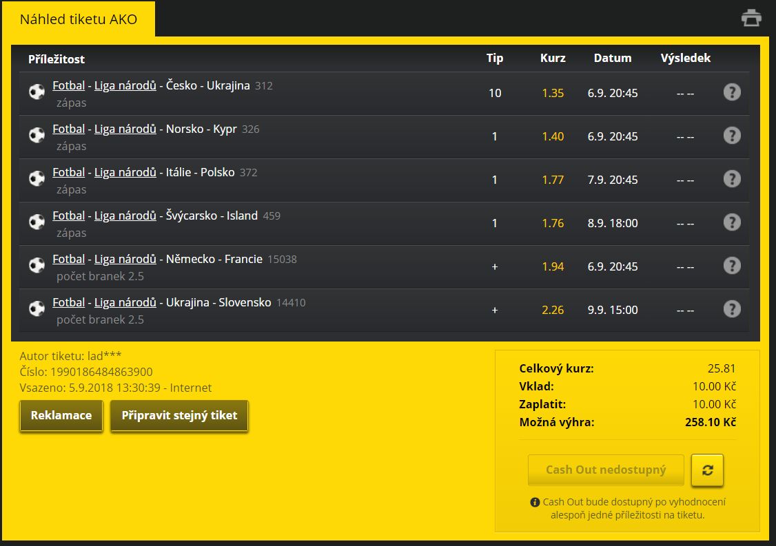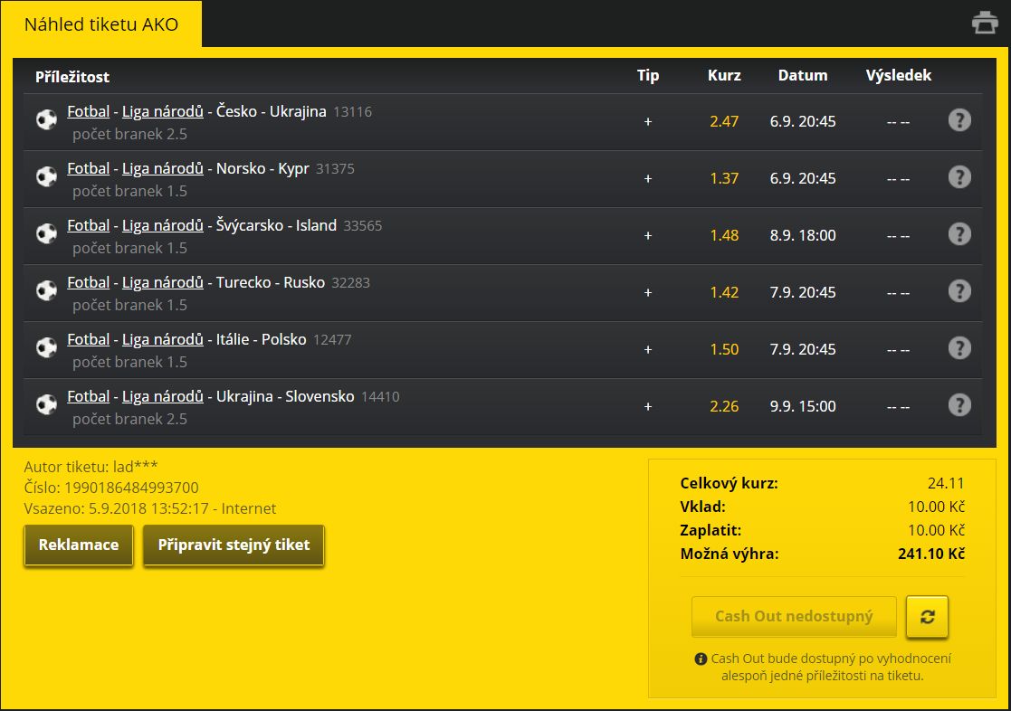 - Na osmý tiket: Over 2,5 g v zápase ČR – Ukrajina / over 1,5 g v zápase Norsko – Kypr / over 1,5 g v zápase Švýcarsko – Island / over 1,5 g v zápase Turecko – Rusko / over 1,5 g v zápase Itálie – Polsko / over 2,5 g v zápase Ukrajina – Slovensko