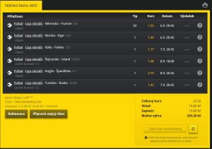 - Na druhý tiket: Neprohra ČR / over 1,5 g v zápase Norsko – Kypr / výhra Turecko / výhra Anglie / over 1,5g v zápase Itálie – Polsko / over 2,5 g v zápase Německo – Francie