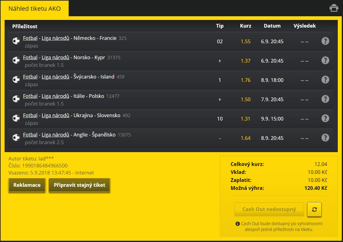 - Na šestý tiket: Neprohra Francie / over 1,5 g v zápase Norsko – Kypr / výhra Švýcarsko / over 1,5 g v zápase Itálie – Polsko / neprohra Ukrajina / under 2,5 g v zápase Anglie – Španělsko