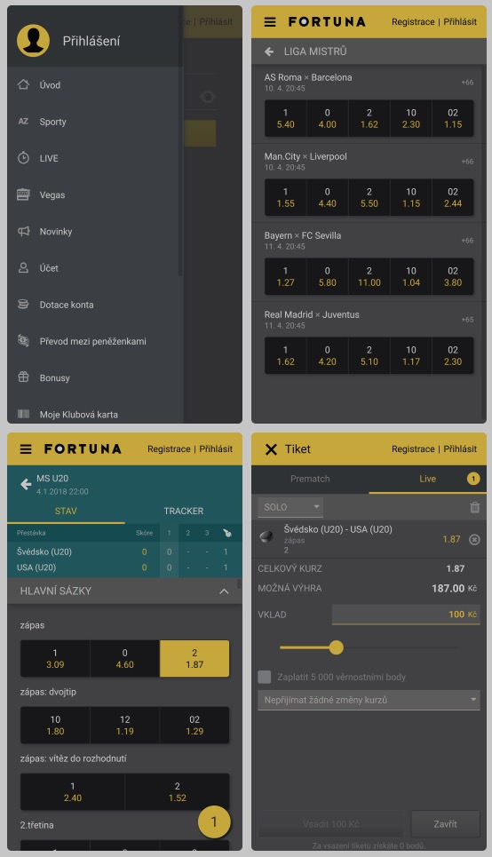 Fortuna nabízí jednu z nejlepších sázkových aplikací na českém trhu. Fortuna sázková aplikace je vyvedena v černé barvě, takže náležitě šetří oči při delším používání, její největší výhodu je ovšem celkově precizní provedení.