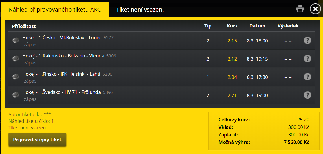 | Třinec | 6 | Mladá Boleslav – Třinec | 2,67 – 4,08 – 2,19 |