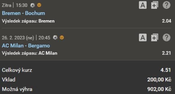 Předpoklad plnohodnotného bodového zisku Werderu Brémy v domácím utkání německé Bundesligy s Bochumí, která je nejhůře hodnoceným mužstvem Bundesligy ve venkovních utkáních a důvěra ve vítězství AC Milán proti nebezpečné Atalantě Bergamo ve víkendovém šlágru dalšího kola nejvyšší italské fotbalové ligy, to je v pořadí poslední únorový Sforziho tiket s odvážným kurzem 4.51 a s tradičním vkladem 200,-Kč.