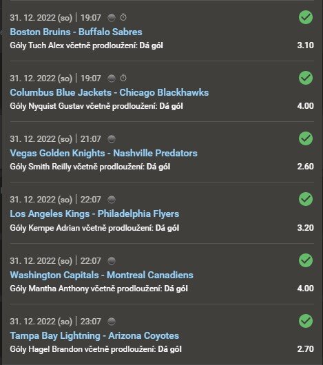 Jen necelých pět hodin před Novým rokem si jeden ze sázejících u Tipsportu vsadil na sedm střelců NHL. Všechny zápasy na tiketu se hrály ještě ten den.