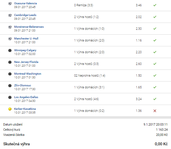 Pojďme postupně. Jeden z klientů Tipsportu (a pozdější smolař týdne) podal 9. 1. 2017 skrze internetové rozhraní této společnosti výše přiloženou sázenku s 10 tipy; 5 hokejovými, 4 fotbalovými a 1 tenisovým. Dílčí kurzy vyjmenovaných příležitostí, ve kterých autor tiketu vždy shodně tipoval možnosti 1/0/2/02, tj. výhru domácích, remízu, výhru hostů či neprohru hostů, spadaly ve všech případech do poměrně širokého intervalu od 1,16 až do 3,46. Z toho po vzájemném vynásobení plyne celkový kurz 1 163,24.