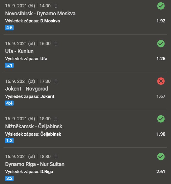 Tiket obsahoval 7 zápasů z české Extraligy a zbylých devět utkání bylo z KHL. Sázející vsázel na vítěze zápasů po šedesáti minutách, ani jednou netipoval remízu, což se nakonec jeví jako ta chyba, které sázejícího antoninvlach stálo bezmála 600 tisíc Kč.