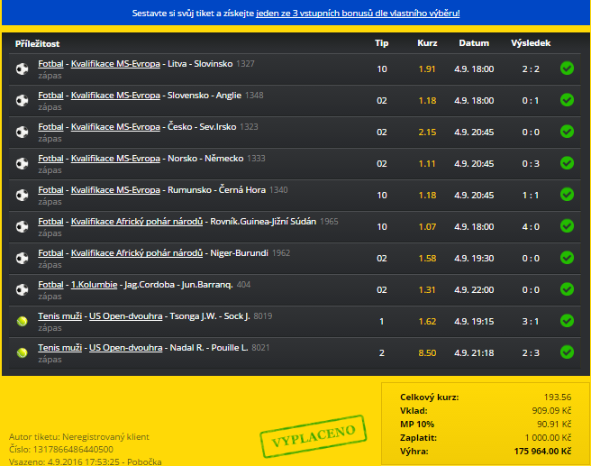 Zajímavostí je, že dílčí kurzy jednotlivých tipů, které byly v intervalu od 1,07 do 8,50, daly dohromady celkový kurz ve výši 193. A když tímto kurzem vynásobíme vsazených 909 Kč, vyjde nám skvělá výhra 175 964,-, která se zdá být vzhledem k výši vsazené částky až neuvěřitelná…