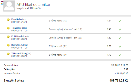 Vsadil jej sázkař registrovaný pod přezdívkou amikor, který dal svých 45 934 Kč všanc pětici tenisových utkání. V těch tipoval buď na celkového vítěze anebo skutečnost, že jedna ze stran vyhraje alespoň 1 set.