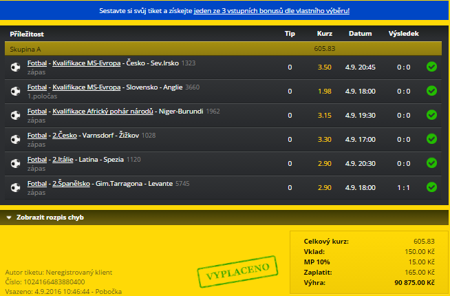 “Takhle se vydělává,” ukázal na začátku měsíce září neregistrovaný klient Fortuny sázkařské veřejnosti, když vsadil 150 Kč (+10% manipulační poplatek) na 6 remíz s kurzy od 1,98 do 3,50!