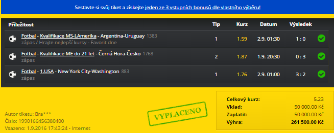A protože jsme již na začátku článku slíbili, že na vás v první, druhém, třetím, čtvrtém i pátém případě čeká opravdový TOP tiket, nebudeme vás dále napínat… Stav “WIN” v případě této sázenky způsobil potěšující výhru 9 192,35 Kč!