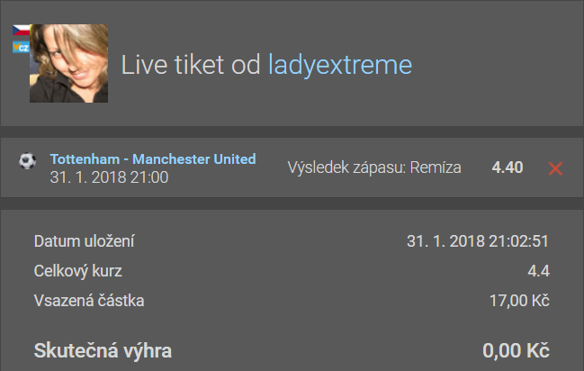 Musím se přiznat, že jsem měla asi také štěstí, protože když jsem se naposledy dívala na fotbal, tak ty kurzy nevycházely, tzn. jednalo by se o další sázku se ztrátou (i když jen malou).