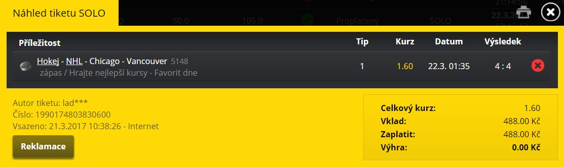 | Chicago – Vancouver (22.3.2017) | NHL | 1 | 1,60 | 488 | 0 |