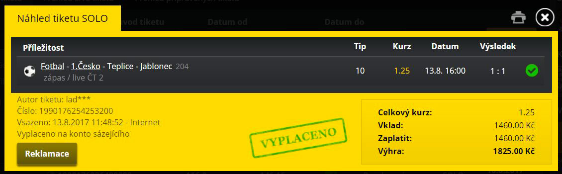 Přikládám několik ilustračních tiketů. Z důvodu náročnosti jsem vybrala pouze několik sázkových kol (a jeden neúspěšný tiket, který mě vážně hodně bolel).