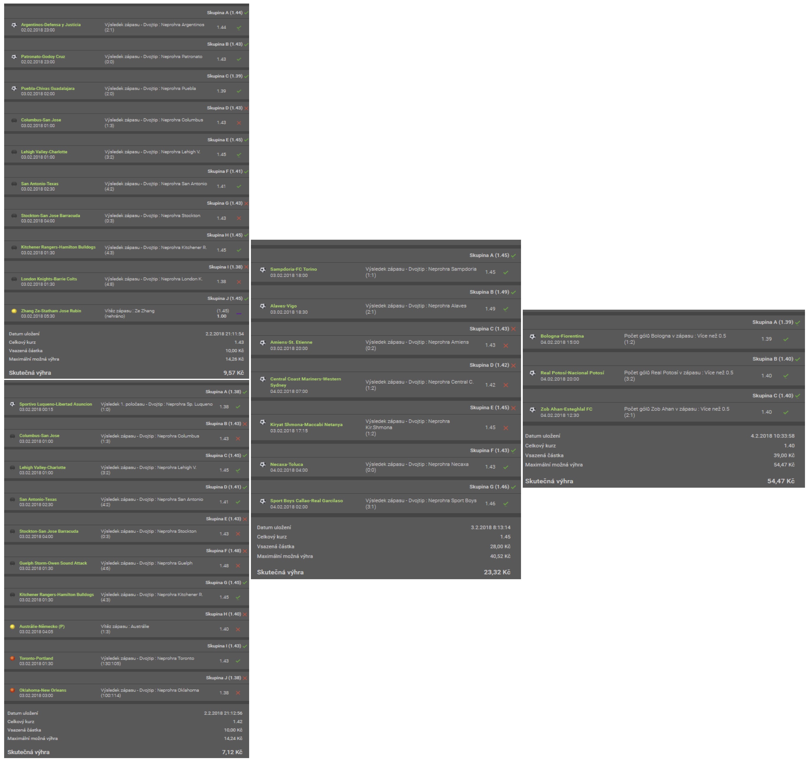 Pokusil jsem se otestovat sázení na kurz přibližně 1,4 v duchu systému Martingale s vyšší mírou progrese. Ta se vypočítá podle známého vzorce: kurz/(kurz – 1), v tomto případě činí 3,5. Abych netočil moc peněz a toto sázení bylo „dostupné“ pro každého, začal jsem se vkladem 1 Kč na zápas.