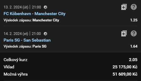 Vklad u tohoto tiketu je 25 175 Kč s kurzem 2.05, potenciální výhra vychází na 51 609 Kč.