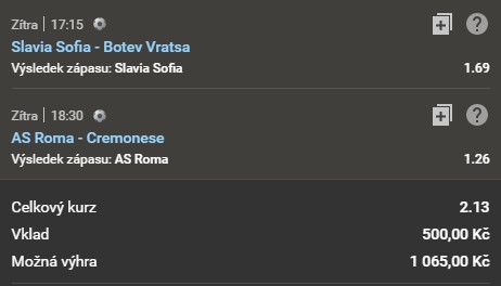 Vklad u tohoto tiketu je 500 Kč, kurz je 2.13. Potenciální výhra tak vychází na 1 065 Kč. Prozatím se nikdo neinspiroval, ale je stále dostatek času. Přidáte se také anebo své peníze dáte na jiné zápasy?