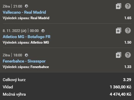 Sázející asemrad vsadil na dvě pondělí fotbalové zápasy, třetí zápas na tiketu se hraje o půlnoci z pondělí na úterý. Real Madrid čeká městské derby s Vallecanem, pro který je to oblíbený soupeř, jelikož je porazili v 16 zápasech z posledních sedmnáctí střetnutí.