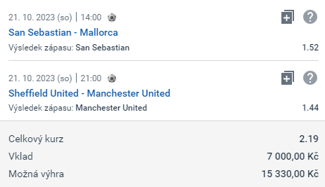 Vklad u tohoto tiketu je 7 000 Kč s kurzem 2.19, potenciální výhra vychází na 15 330 Kč. Prozatím se inspirovalo přes sto sázejících, můžete být tak dalším, kdo se přidá, a inspirujete se anebo své peníze dáte na jiné zápasy?