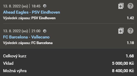Vklad u tohoto tiketu je 5 000 Kč, kurz je 1.68, potenciální výhra vychází na 8 400 Kč. Do první zápasů schází ještě několik dní, prozatím se nikdo neinspiroval. Přidáte se také anebo své peníze dáte na jiné zápasy?