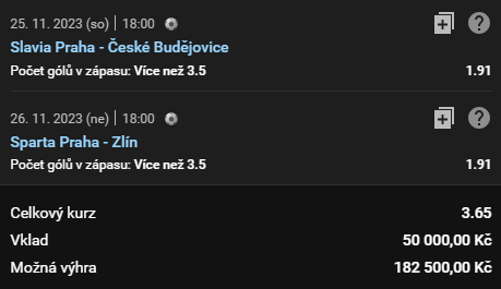 Vojik vsadil na pražská S, u obou volil stejnou sázku, a to že v každém ze zápasů padnou minimálně čtyři branky. Jak Slavia v sobotu, tak Sparta v neděli hrají své zápasy na svém stadiónu. Pražská S se nachází na prvních dvou místech a střetnou se o víkendu s týmy, které se nachází na posledních dvou příčkách.