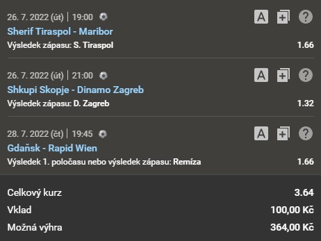 Viktoria Plzeň a Slavia jsou blízko postupu do další fáze evropských pohárů, ale Sparta si bezbrankovým výsledkem moc nepomohla, jelikož teď jako jediný český zástupce bude hrát venku. Zda převahu z minulého přetaví ve čtvrtek na postup, na to si musíme ještě chvíli počkat. Ale teď se tiket neskládá z kvalifikačních zápasů o Ligy mistrů a Evropskou konferenční ligu.