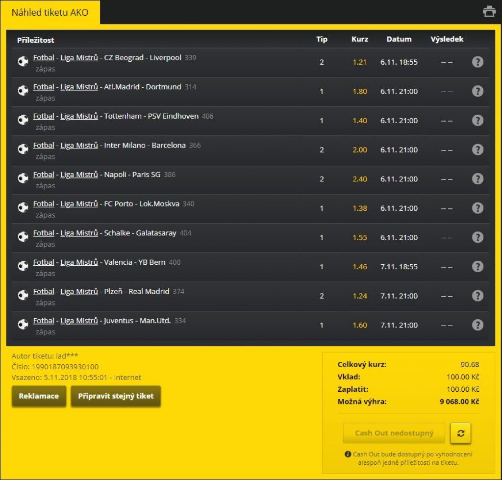 Z toho důvodu jsme vytvořili tiket na Ligu mistrů z nejoblíbenějších tipů, tedy tipů, které se nejčastěji sází u Fortuny a Tipsportu. Na konci článku najdete také možnost vsadit si všechny tyto příležitosti v jednom tiketu.