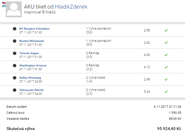 Za celou redakci KurzoveSazeni.com tipérovi HladikZdenek gratulujeme a přejeme, ať se ho sázkařské štěstíčko drží i nadále!