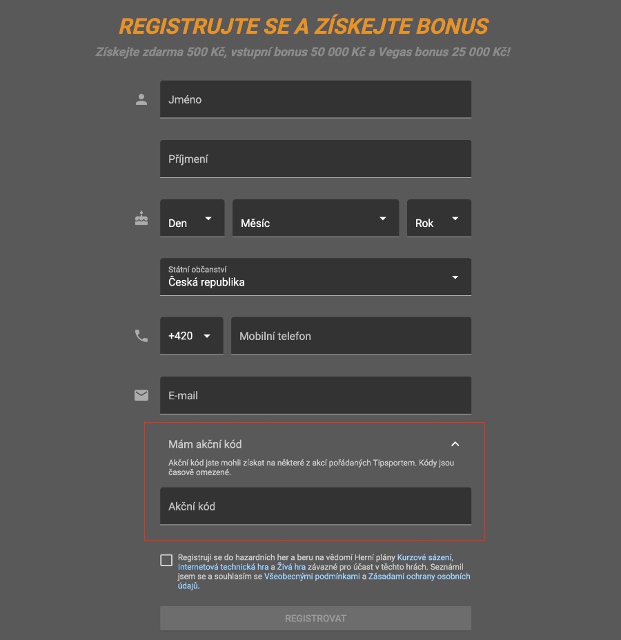 Promo kód od Tipsportu lze aktivovat dvěma různými způsoby. Propagační kód lze zadat už při samotné registraci do této sázkové kanceláře, což je asi nejběžnější způsob aktivace. V tomto případě stačí kliknout na možnost „Mám aktivační kód“ na konci registračního formuláře a do odkrytého okna vepsat přesný číselný kód.