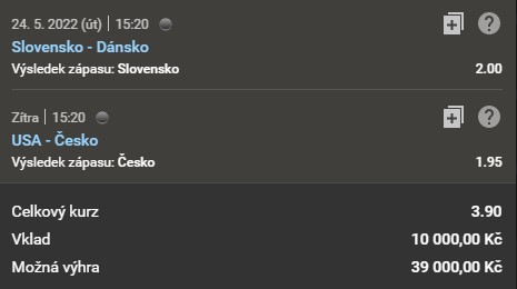 Tatka0 vsadil u Tipsportu již v úterý 17.5. tiket, na dva hokejové zápasy probíhajícího Mistrovství světa, které se letos koná ve Finsku. První zápas na tiketu začíná již v pondělí od 15:20. Druhý zápas začíná o čtyřiadvacet hodin později.