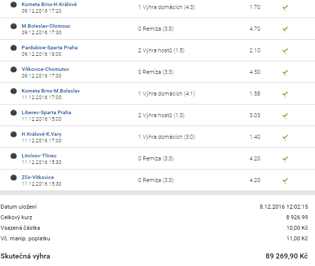 …dokud šance existuje, vyplatí se za každých okolností věřit. Probíraný tiket budiž tomu názorným důkazem! Sázka byla vzhledem k výsledkům vyhodnocena jako “WIN” a společnost Tipsport tak díky tomuto počinu zchudla o necelých 90 litrů českých zlaťáků, přesněji řečeno 89 269,80 Kč!