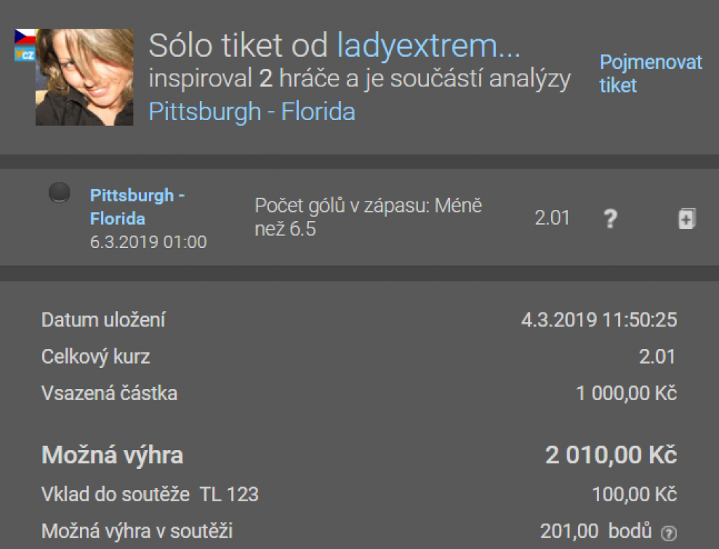 Pittsburgh má ve svých řadách takové ofensivní hvězdy jako je Crosby nebo Malkin, Florida potom třeba Huberdeaua nebo Barkova. Společně s tím se potom člověku automaticky evokuje velký počet branek, ale to není úplně pravdivé. Do hranice 6,5 gólu se vejde obrovská spousta zápasů Pittsburghu i Caroliny, proto se za tento kurz vyplatí vsadit právě under.