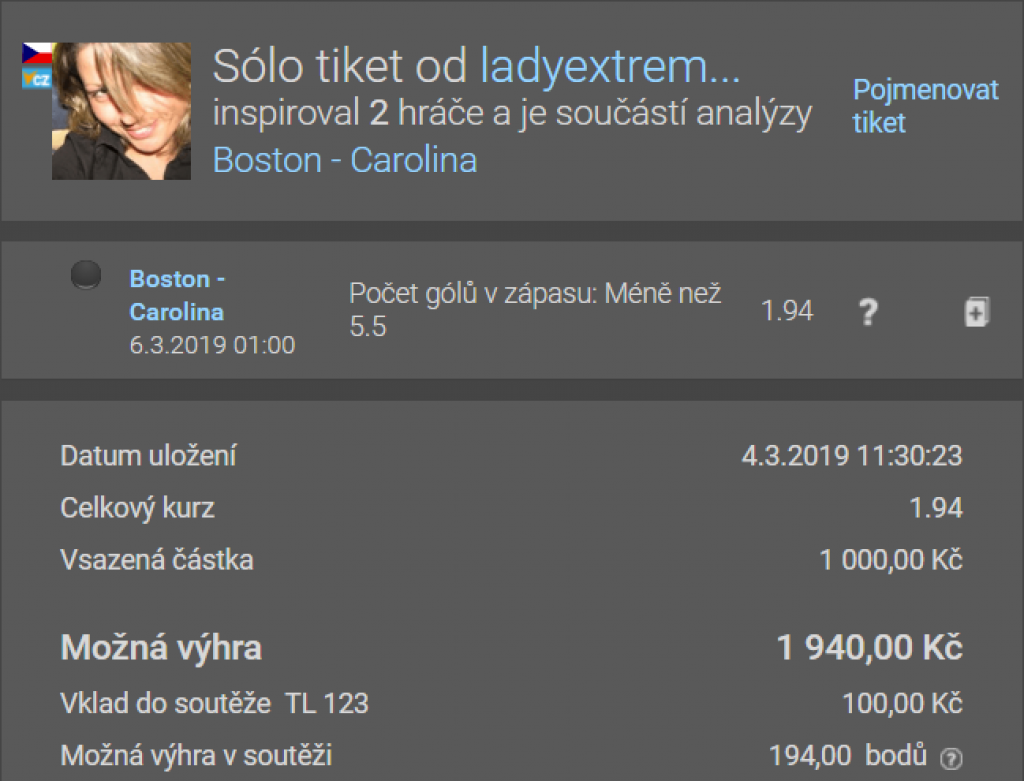 Boston a Carolina jsou ofensivními esy nabité zámořské celky, které budou vždycky patřit k tomu lepšímu, co nám útočné lajny v NHL nabídnou. Boston je v tomto ohledu zkušenější, ale i hvězdičky Caroliny pomalu dorůstají a už brzy začnou zářit. Tyto skutečnosti by někoho mohly přimět k sázce na over, ale to by bylo proti zásadám value bettingu. Boston a Carolina totiž mají také velký počet underů, což společně s cenou jasně nahrává sázce na under.