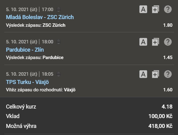 Fotbal díky reprezentační pauze není u sázkařů tak moc v kurzu. Tentokrát je tiket sestaven pouze z hokejových zápasů. Všechny utkání se budou hrát v úterý. Ten první zápas na tiketu začíná již v 17 hodin.