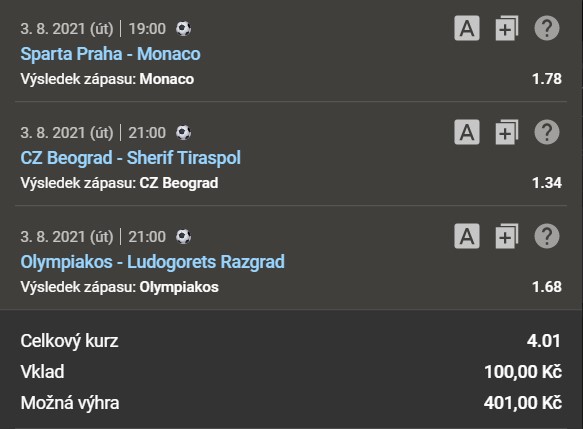 Následující tiket obsahuje tři sázkové příležitosti a patří k nejčastěji podávaným sázkám v českých sázkových kancelářích. Kurz je 4,01. Budeš věřit v moudrost davu a vsadíš si s námi?
