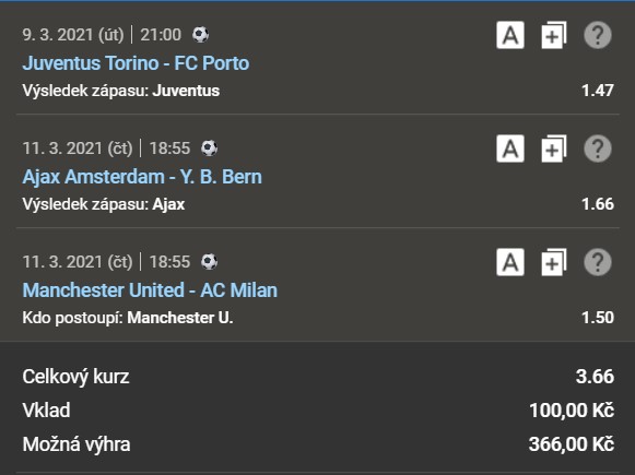 Následující tiket obsahuje tři sázkové příležitosti a patří k nejčastěji podávaným sázkám v českých sázkových kancelářích. Kurz je 3,66. Budeš věřit v moudrost davu a vsadíš si s námi?