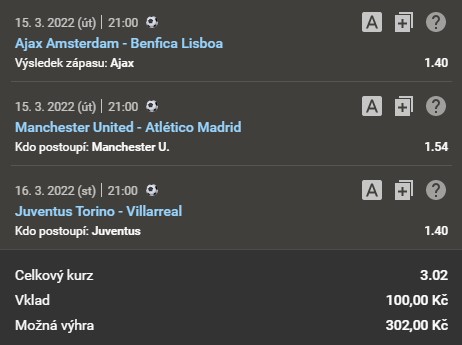 Zbývají ještě čtyři odvety v rámci osmifinále Ligy mistrů, které se odehrají toto úterý a středu. V rámci následujícího tiketu jsou obě úterní utkání a jedno středeční. Jeden tip je na výhru domácího celku, další dva tipy jsou zaměřeny pouze na postup do čtvrtfinále Ligy mistrů.