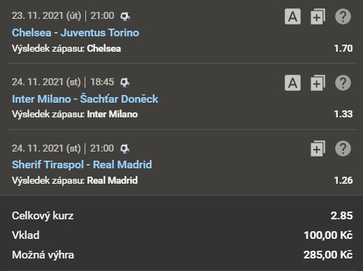 Následující tiket obsahuje tři sázkové příležitosti a patří k nejčastěji podávaným sázkám v českých sázkových kancelářích. Kurz je 2,85. Budeš věřit v moudrost davu a vsadíš si s námi?
