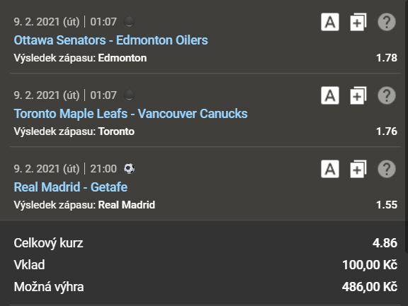 Byly vybrány nejčastěji vsazené události, kdy se zápas budou hrát v úterý 9.2. Na tiketu se nachází dva zápasy z NHL a jediný úterní zápas LaLigy, což je dohrávka prvního kola.