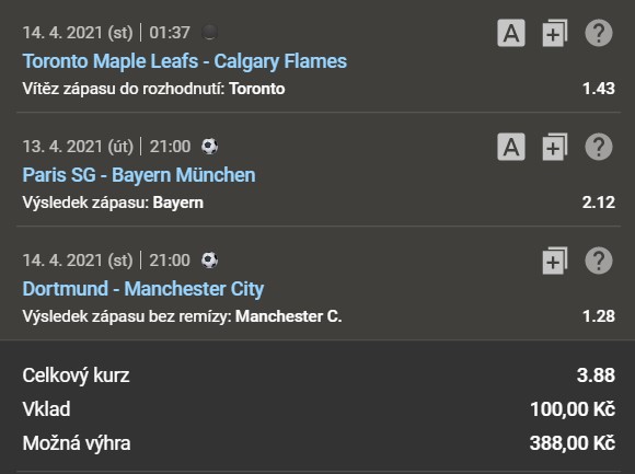 Následující tiket obsahuje tři sázkové příležitosti a patří k nejčastěji podávaným sázkám v českých sázkových kancelářích. Kurz je 3,88. Budeš věřit v moudrost davu a vsadíš si s námi?